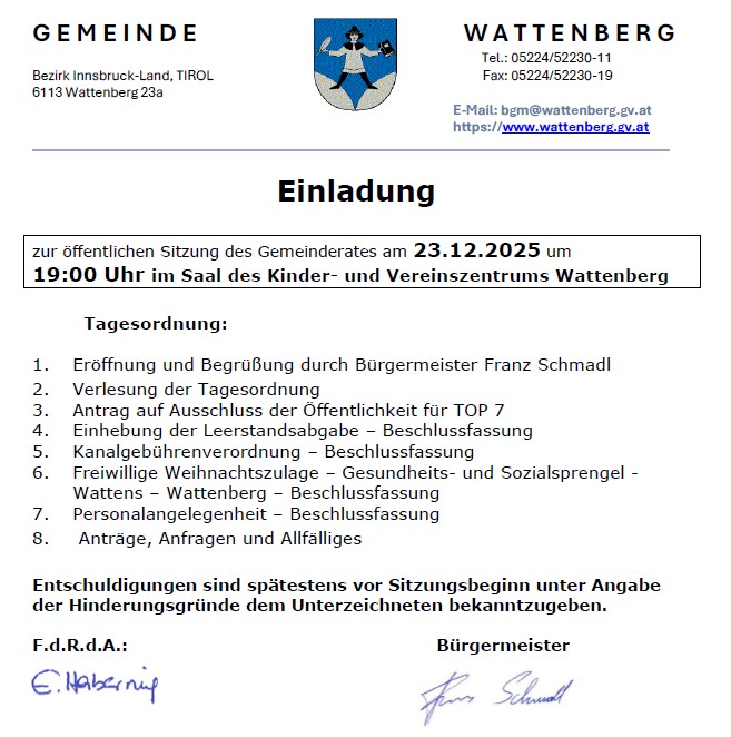 NEWS Einladung zur öffentlichen Gemeinderatssitzung am 23. Dezember 2025 um 19:00 Uhr im Saal des KiVZ Wattenberg Download *.pdf-Datei: Einladung_GR-Sitzung_23.12.25